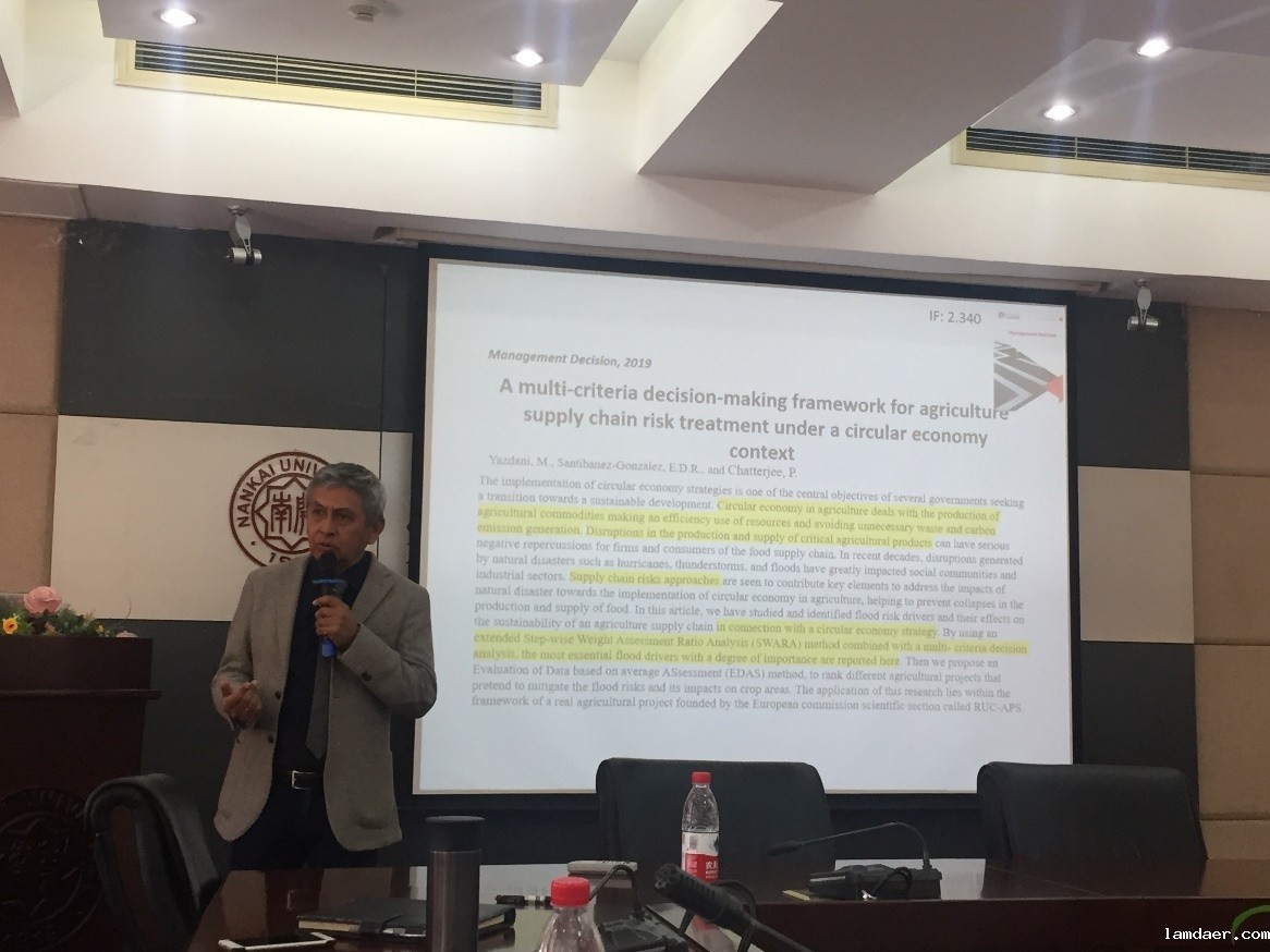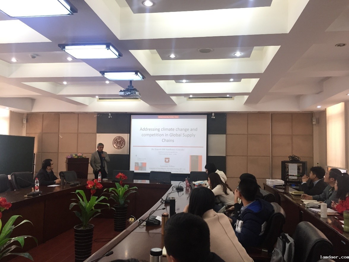 在讲座中,Ernesto DRS Gonzalez教授梳理了绿色供应链管理、低碳经济方面的一些概念,指出了企业运营管理策略如何影响气候与环境、大数据等新技术趋势如何影响低碳经济等相关的重要研究问题,重点介绍了他及其科研团队近期在绿色供应链和循环经济方面的部分代表性论文,并与现场师生就闭环供应链模型构建、大数据分析技术与可持续供应链管理的结合途径等做了详尽交流。