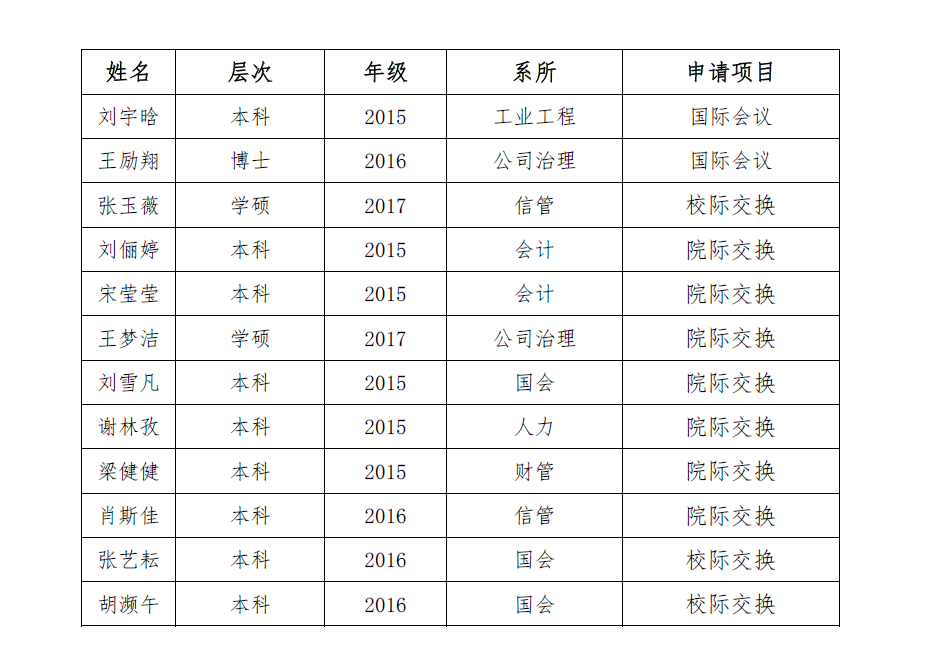 根据学院《商学院学生国际交流项目资助计划(第一批)》通知,经学生报名和学院审核,最终评出刘宇晗等12位同学为资助对象,现予公示,公示名单附后。