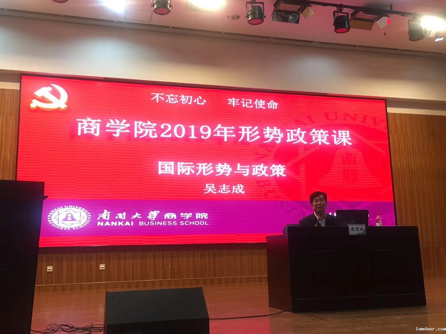 (通讯员 刘劲良 毕媛)10月10日下午15:30,商学院本学期“形势与政策”课程暨商学院党校2019年秋季培训班于商学院大报告厅正式开班。第一讲由南开大学国际学术交流处处长吴志成教授主讲,主题为国际形势与政策。吴志成教授以“新时代的全球变革大势”、“中国发展面临的外部新挑战”、“中国特色大国外交”、“构建人类命运共同体”四个模块为基础拓展探讨了单边主义、逆全球化涌动、民粹主义、一带一路建设等与当代大学生切身相关的热点话题,帮助商学院学子掌握正确分析形势的立场、观点和方法。商学院2019级本科生与研究生新生党员在场认真学习本次内容,课程在热烈的掌声中落下帷幕。
