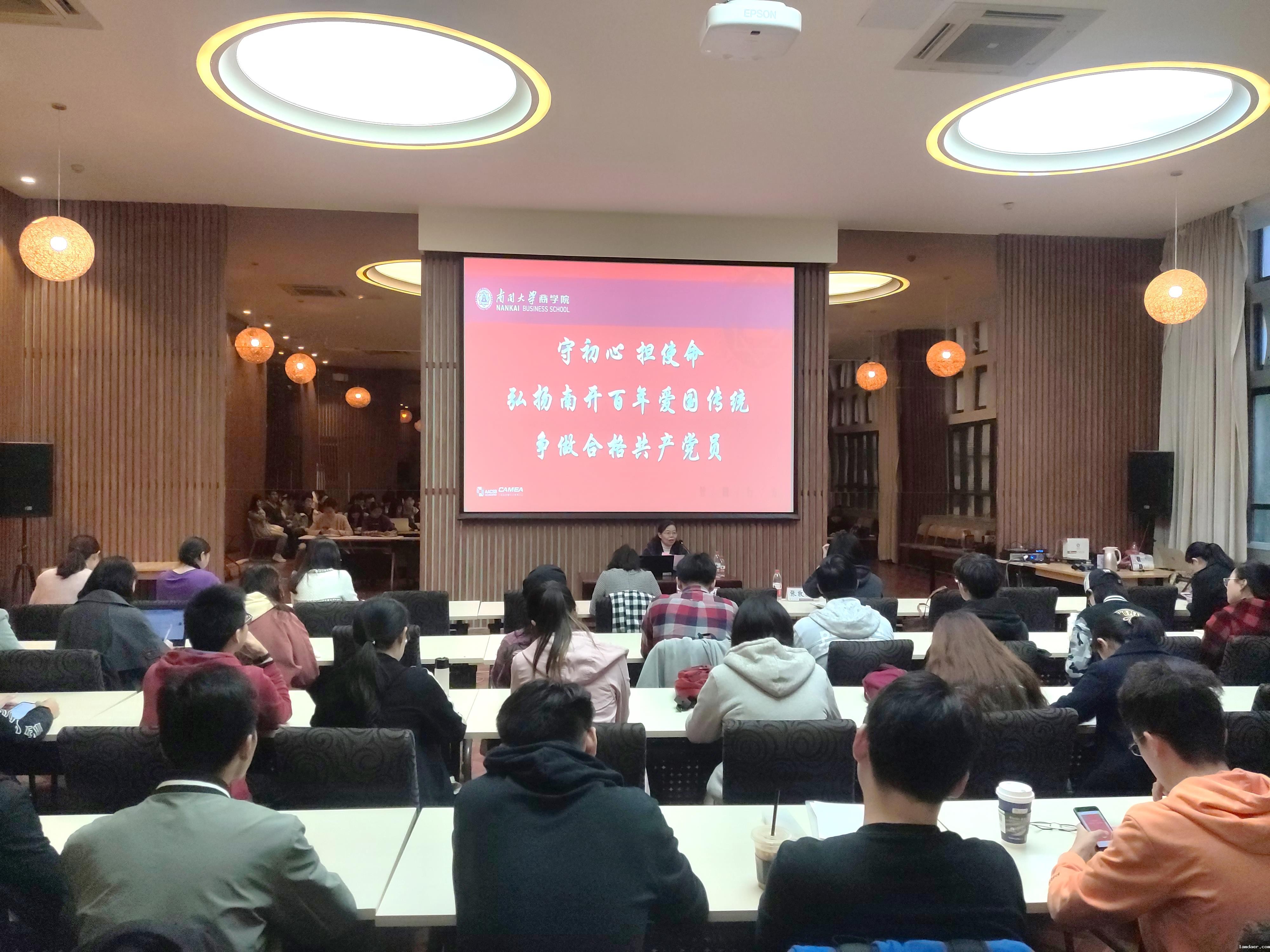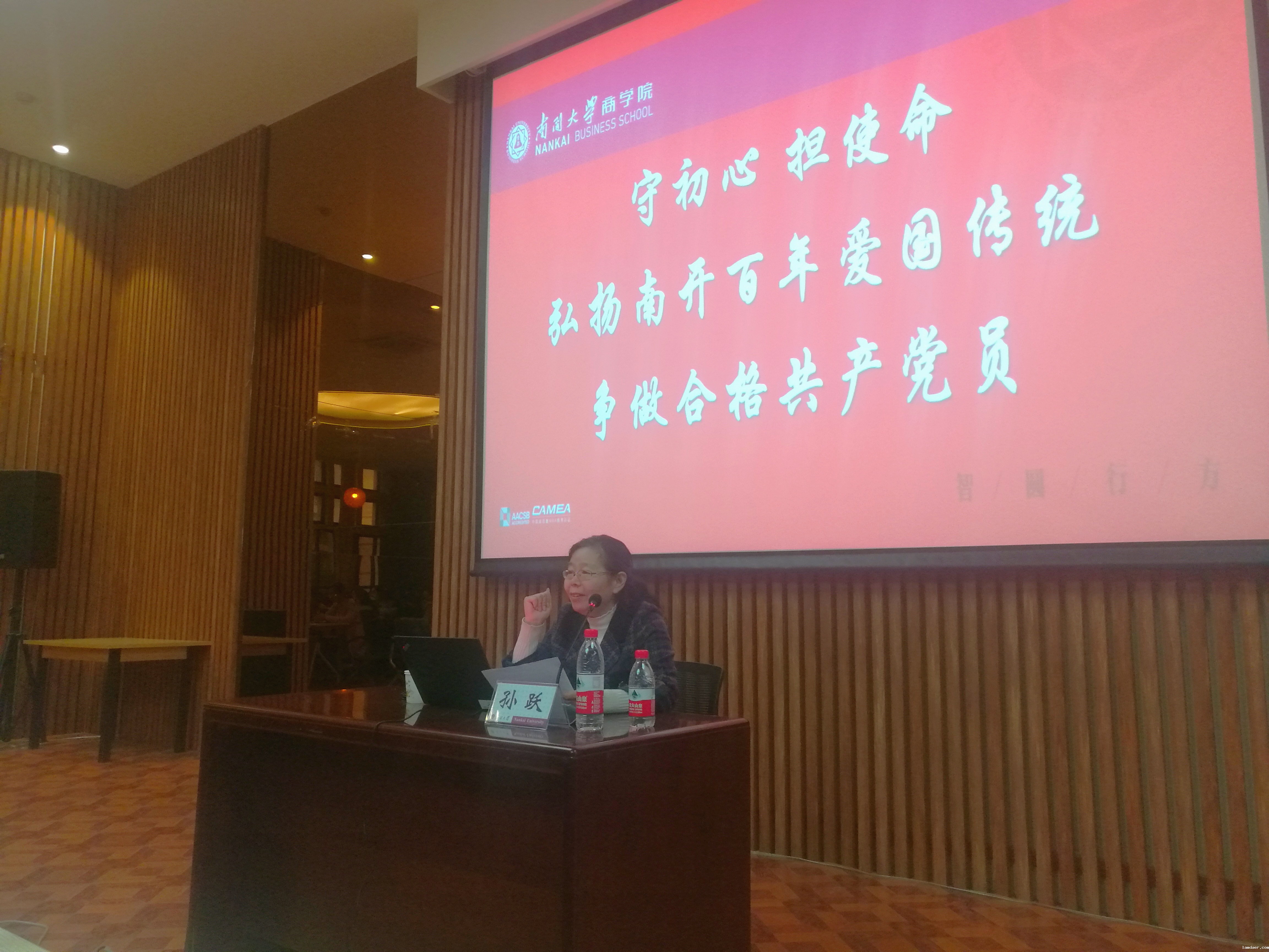 回归主题,如何成为一名合格的共产党员?孙跃提出六点要求:一是要有远大的理想,与时代同步伐,与人民共命运;二是坚守爱党爱国的底线要求,胸怀忧国忧民之心,爱国爱民之情;三是要担当时代责任,在担当中历练,在尽责中成长,努力成为全面发展的社会主义建设者和接班人;四是要勇于砥砺奋斗,实干、苦干、加油干,书写青春亮丽色彩;五是要练就过硬本领,掌握科学知识提高内在素质,学习理论方法提升党性修养;六是要不断锤炼品格修为,明大德、守公德、严私德,自觉践行社会主义核心价值观。她勉励师生党员坚守初心保本色,勇担使命创事业,为南开大学和商学院的新百年建设贡献更大力量!