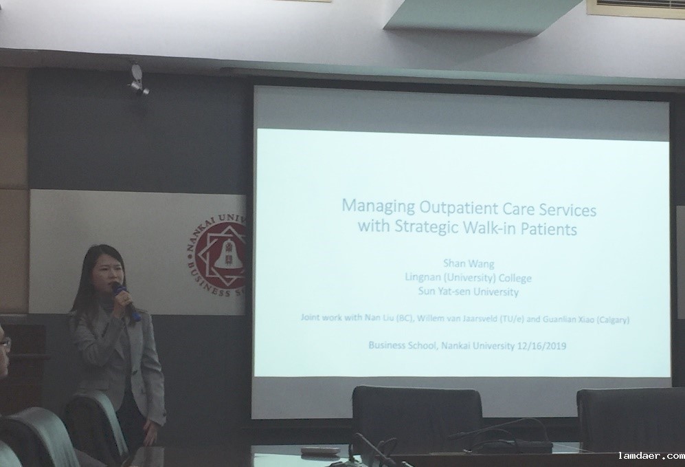 应南开大学商学院管理科学与工程系邀请,2019年12月16日,中山大学岭南学院助理教授王杉老师到访南开大学商学院,并于上午10:00至11:40在B1003会议室进行了主题为“Managing Outpatient Care Services with Strategic Walk-in Customers”的学术讲座,讲座由南开大学商学院管理科学与工程系主任李勇建教授主持,管科系硕士生、博士生及部分教师聆听了讲座。