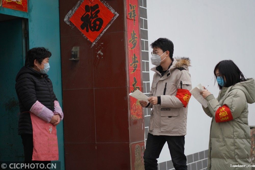 ↑2月14日,河北省内丘县大孟村镇小孟村大学生志愿者张国庆(中)、张晓庆(右)在村民家门口对村民摸排登记。CICPHOTO/刘继东 摄