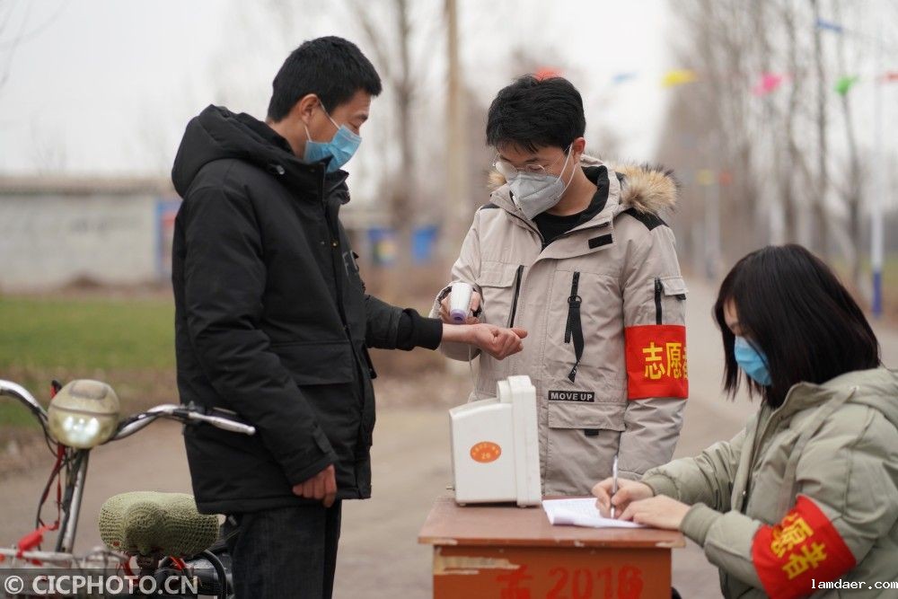 ↑2月14日,河北省内丘县大孟村镇小孟村大学生志愿者张国庆(中)、张晓庆(右)在村口检测点为过往行人测温登记。CICPHOTO/刘继东 摄