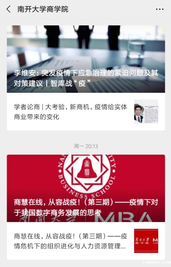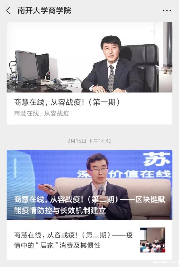 在举国上下众志成城、共克时艰的情况下,南开商科人也一直在行动。专家学者充分发挥专业优势,积极主讲以防疫抗疫为主题的特殊在线课堂。截止目前,“商慧在线,从容战疫”智慧课堂已开展三期共六讲,内容涵盖了《疫情后的创业机会》、《提高公共健康风险智慧化治理能力》、《疫情中的“居家”消费及其惯性》、《区块链赋能疫情防控与长效机制建立》、《疫情下对于我国数字商务发展的思考》、《疫情危机下的组织进化与人力资源管理创新》等方面,运用商科智慧为科学应对疫情防控,理性面对疫情中、后期的经济现象提供建议参考。创新课堂在南开大学商学院和南开MBA中心微信公众号相继“播课”后,受到师生和校友广泛关注和热烈讨论。