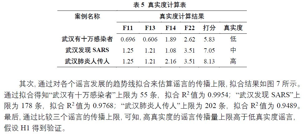 本文将“武汉有十万感染者”、“武汉发现SARS”和 “武汉肺炎人传人”来进行实证分析(附录2)。首先将三组案例对照前文4.1杨所述的真实度评价指标进行打分,然后根据6.1节得出的真实度系数进行计算,计算结果如表5所示。可知,“武汉有十万感染者”真实度最低;“武汉发现SARS”真实度中等;“武汉肺炎人传人”真实度最高。
