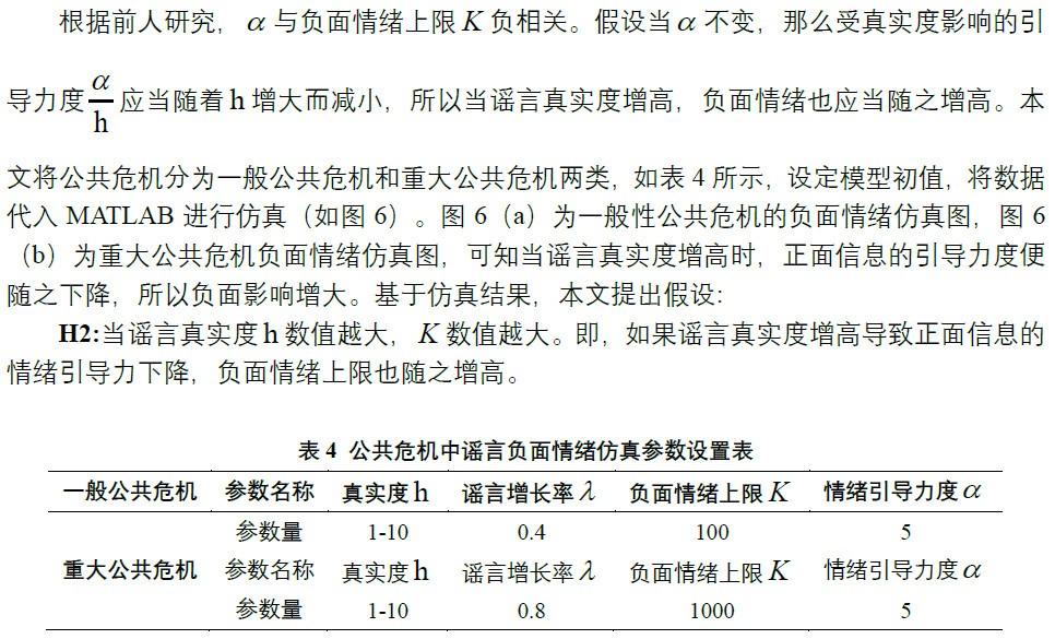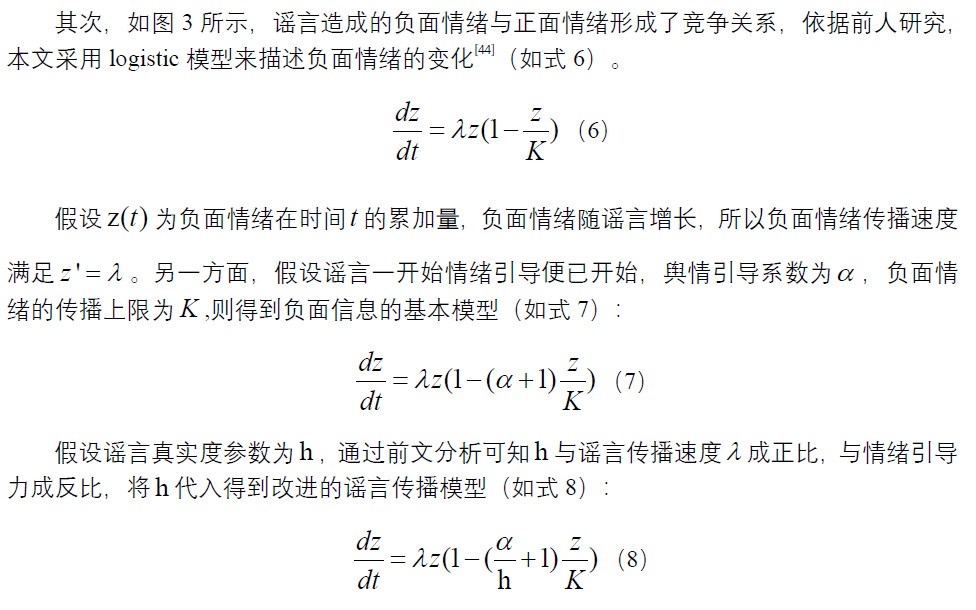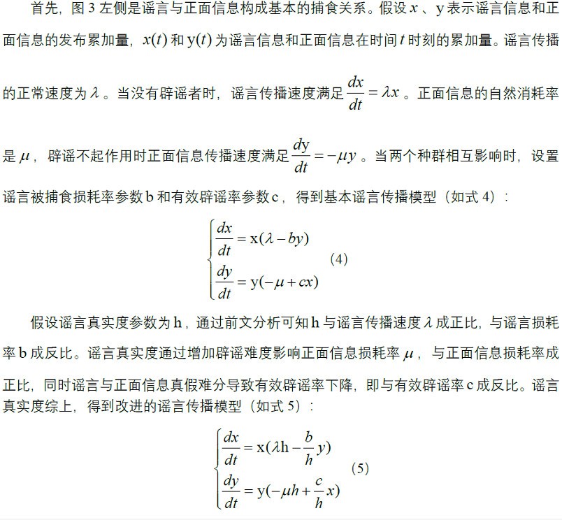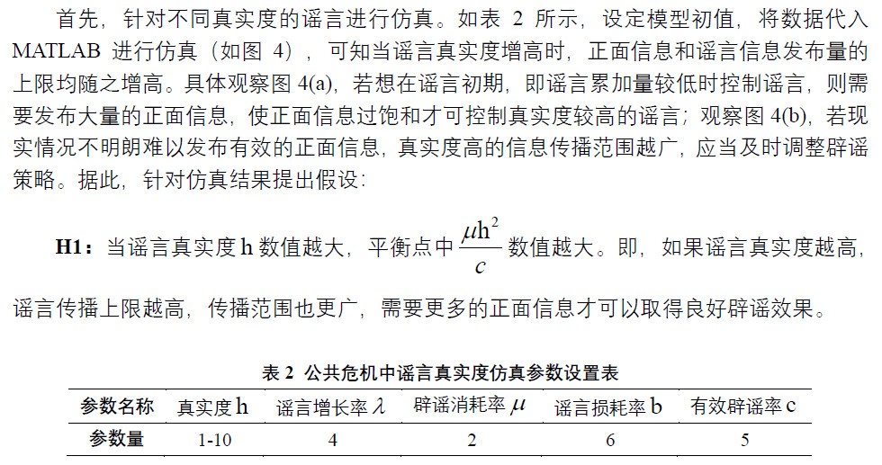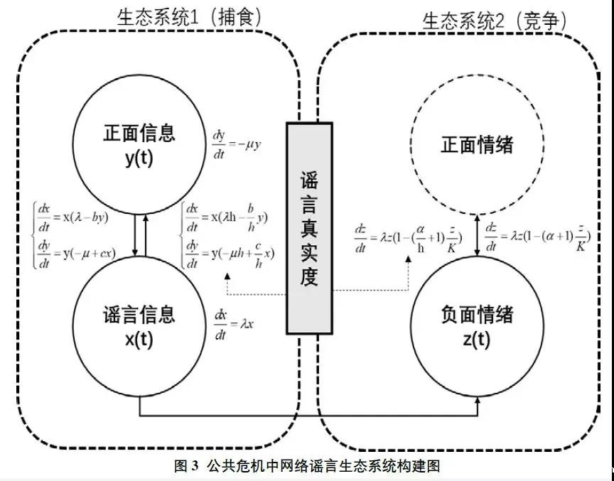 第三,利用微分方程对谣言、正面信息之间的关系进行信息生态建模。分别建立谣言-正面信息生态系统和谣言传播过程中负面-正面情绪生态系统,通过数值仿真得到有关谣言真实度的影响路径假设。