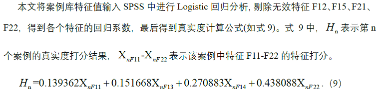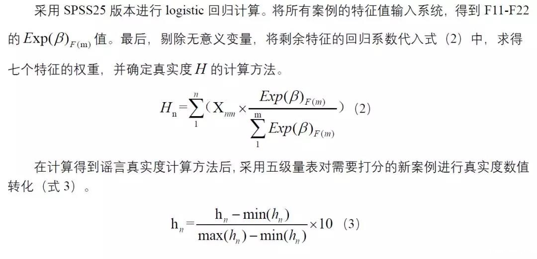 首先,通过爬虫得到当天最热新闻帖子列表,针对官方辟谣事件列表(如新浪微博官微发布的辟谣列表),对新闻帖子是否为谣言进行0、1赋值,形成样品案。然后,依据真实度评价指标对每个案例的特征值进行评分,作为Logistic回归分析的计算输入量。