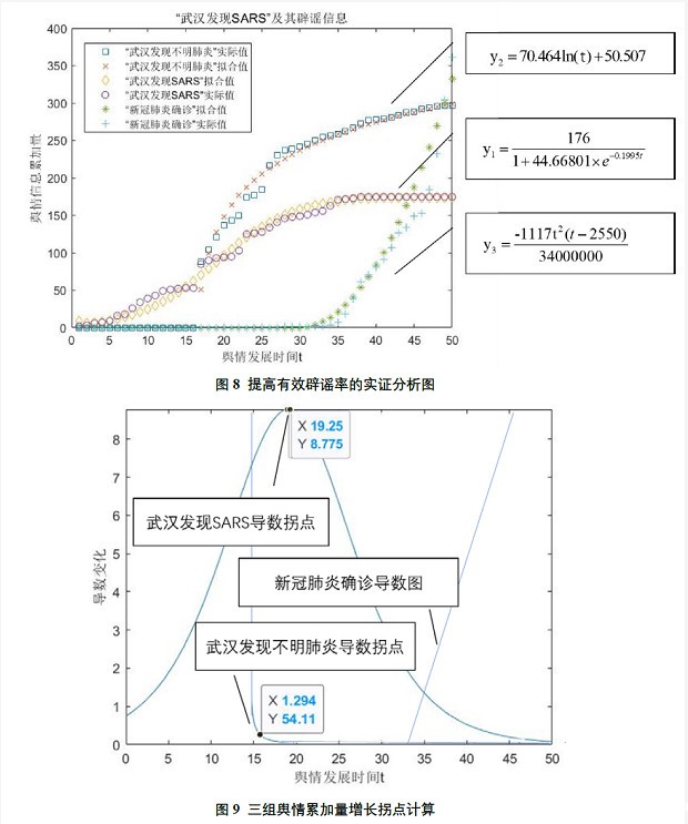 结合附录3中关于谣言“武汉发现SARS”以及与其相关的两组辟谣信息的相关数据,对三组数据累加量特征进行初步观察,并进行拟合,得到“武汉发现SARS”的拟合图(图8),对三组信息的拟合表达式求二阶导数,以得到三组信息的累加量增长拐点(计算结果如9),得到比较结果(图10)。计算可得,“武汉发现SARS”在17日左右进入增长后期,即增长率开始降低,与“武汉发现不明肺炎”的爆发期吻合;“武汉发现SARS”在30日左右进入消退期,与“新冠肺炎确诊”发布时间吻合。“武汉发现不明肺炎”的二阶导数与“武汉发现SARS”负相关,即当此辟谣信息大量发布时,谣言增速变缓。“新冠肺炎”的二阶导数与谣言、“武汉发现不明肺炎”皆负相关,即当此辟谣信息大量发布时,谣言快速消退,同时低说服力的辟谣信息也开始消退。