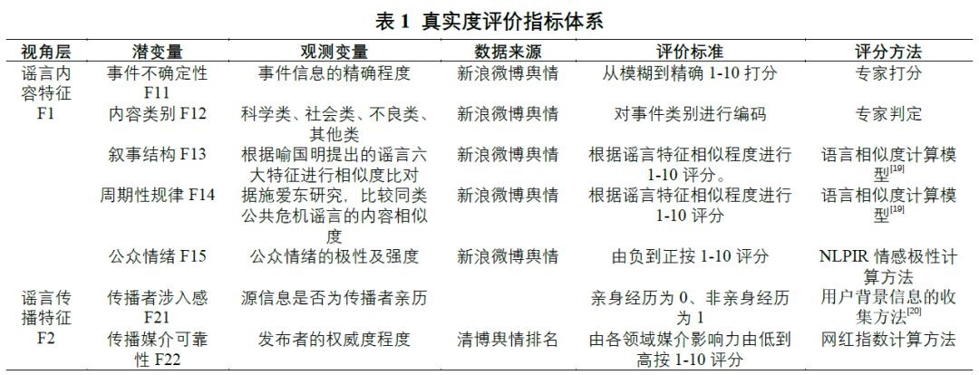 第一、通过定性分析对谣言进行概念化,构建谣言真实度评价指标与评分体系。