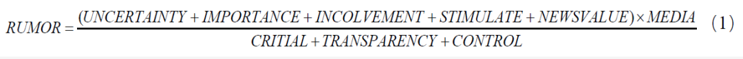 其中,分子部分从事件角度讲包括“不确定性”、“重要性”、“新闻价值”;从传播者角度讲包括“涉入感”和“刺激性”,同时经由媒体放大。同时,谣言传播与传播者的“批判意识”、传播环境的“透明度”及“管控力度”负相关。同时,就谣言的内容而言,喻国明对基于腾讯大数据筛选的六千余条网络谣言进行了内容类别、叙事结构、场景构筑、标题特征四方面的文本分析。施爱东发现谣言内容的周期性与社会活动的周期性、时间季节性、代际规律、相似的社会条件与社会心理状态有关。基于前人研究,本文主要研究的谣言要素包括事件不确定性、传播者涉入感、传播媒介、内容类别、叙事结构、内容周期性和公众情绪因素。