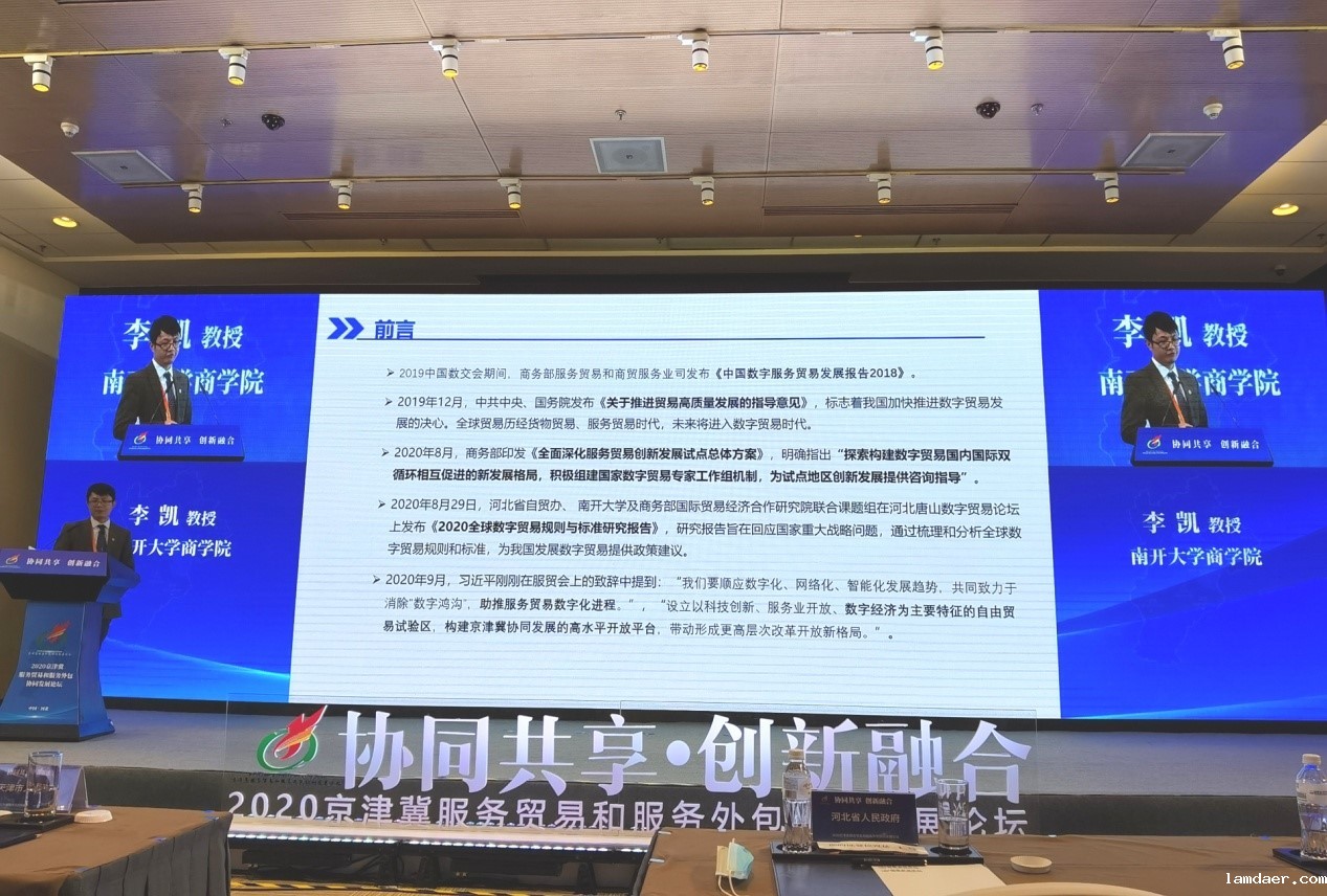 2020年9月5日,我院数字商务研究中心主任李凯教授受主办方邀请,参加在国家会议中心举办的2020中国国际服务贸易交易会,并在2020京津冀服务贸易和服务外包协同发展论坛做题为“全球数字贸易规则分析与发展提议”的主旨演讲。
