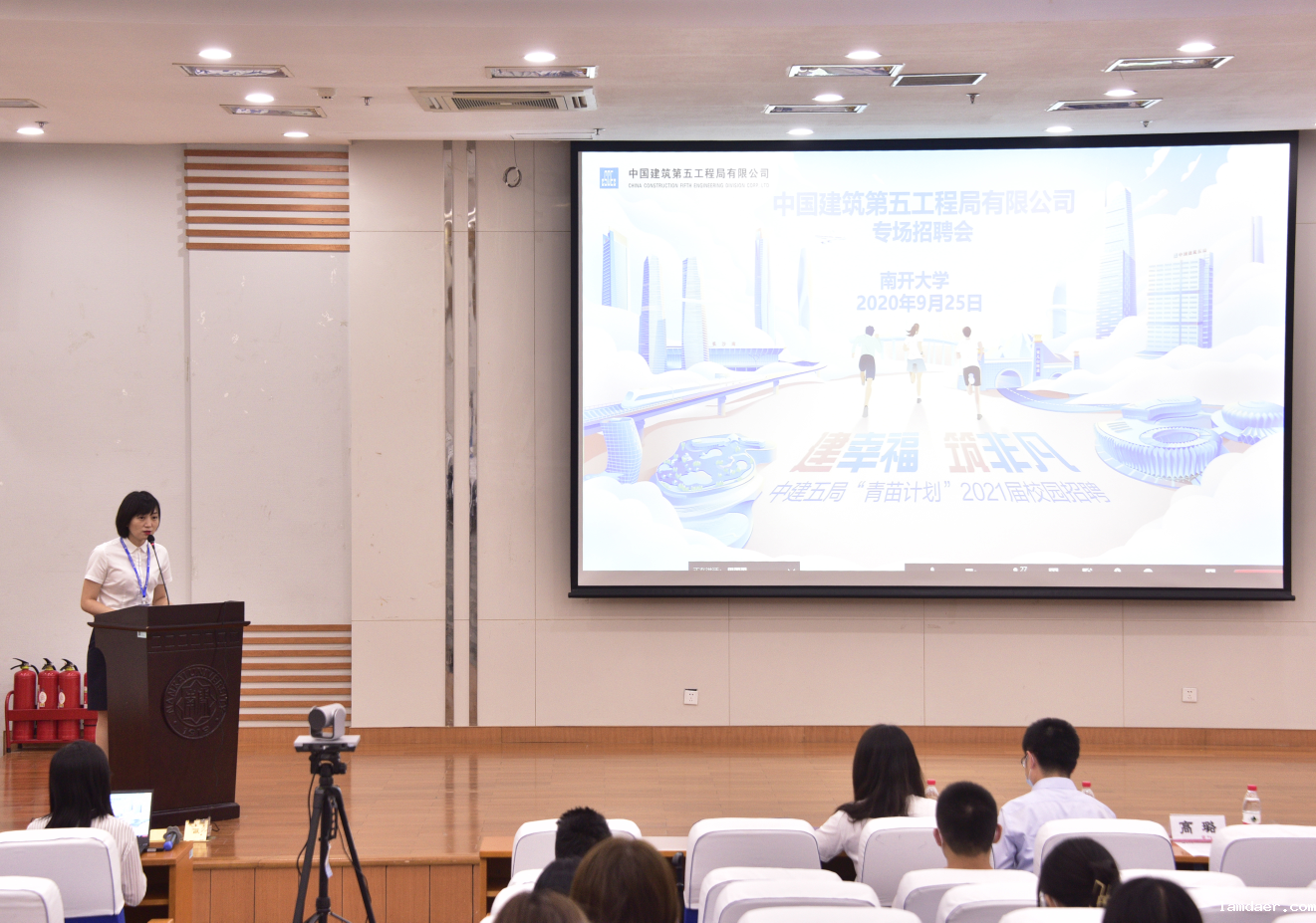 就业推动会首讲邀请到中国建筑第五工程局有限公司校园招聘经理高璐,针对商学院学生进行招聘宣讲。通过公司发展历程、组织构架、市场布局、社会责任等方面向同学们介绍中建五局公司,并充分介绍了学生关心的青苗计划、薪酬福利、招聘需求等内容。