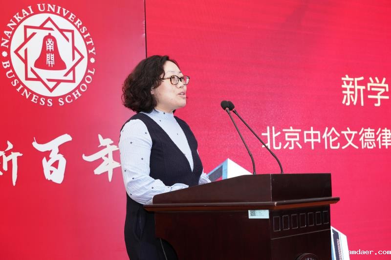 北京中伦文德律师事务所高级合伙人邓懿女士作为EXED新学员代表发言。邓懿女士讲述了自己报名新时代企业领导者(ELP)高级课程班的初衷,希望与南开大学商学院达成良好互动,实现自我提升。