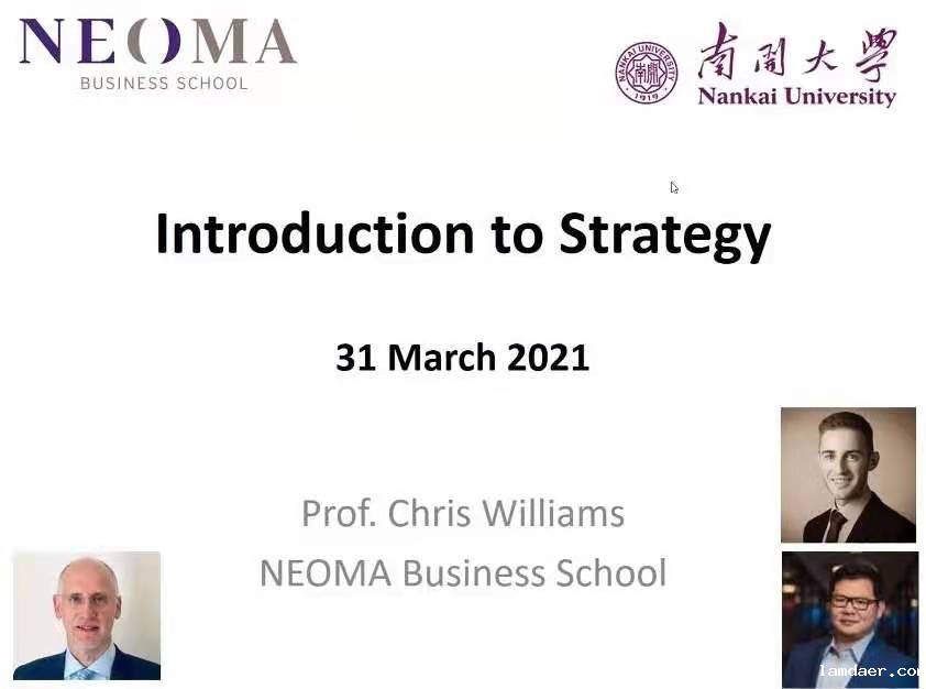 2021年3月31日下午,第四期南开-诺欧大讲坛线上学术讲座成功举办。本期讲座诚邀法国诺欧商学院战略与创业系Christopher Williams教授。他的研究领域包括国际战略、国际企业与环境的创新、组织复原力。Christopher Williams教授拥有20年与国际企业创新项目的合作经验。他的研究发表在《亚太管理杂志》、《国际商业评论》、《商业研究杂志》、《管理学杂志》、《管理研究杂志》、《世界商业与研究政策杂志》等国际知名期刊上。Christopher Williams教授为南开大学中法诺欧国际合作办学项目电子商务专业学生与法国诺欧商学院相关专业学生线上开展了以《战略概论》为主题的学术讲座。讲座案例文献的第一作者,Koenig & Bauer企业顾问Florian Wiesner先生同时参会。会议由中法诺欧合作办学项目主任、管理科学与工程系李凯教授主持。