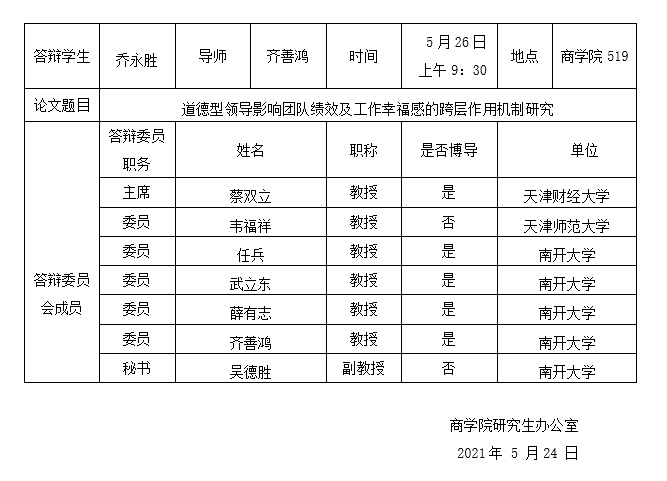 商学院博士生乔永胜毕业(学位)论文答辩公告