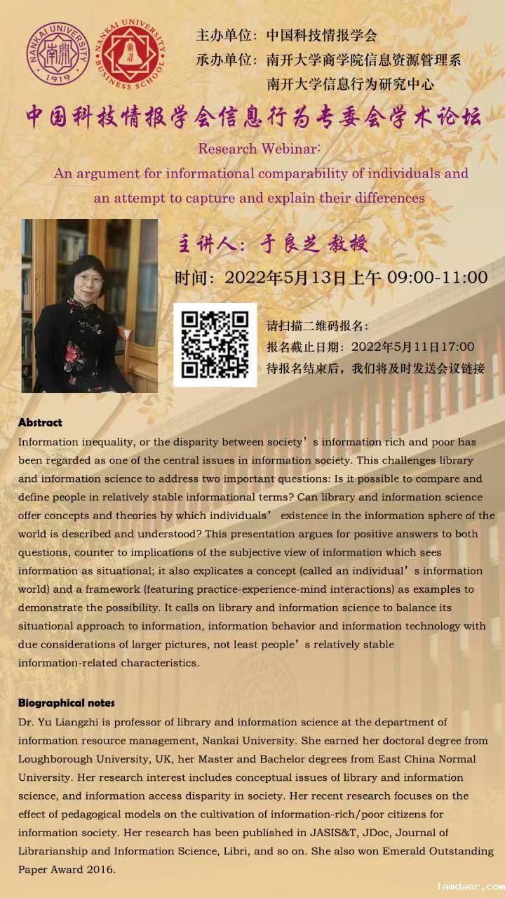 Dr. Yu Liangzhi is professor of library and information science at the department of information resource management, Nankai University. She earned her doctoral degree from Loughborough University, UK, her Master and Bachelor degrees from East China Normal University. Her research interest includes conceptual issues of library and information science, and information access disparity in society. Her recent research focuses on the effect of pedagogical models on the cultivation of information-rich/poor citizens for information society. Her research has been published in JASIS&T, JDoc, Journal of Librarianship and Information Science, Libri, and so on. She also won Emerald Outstanding Paper Award 2016.