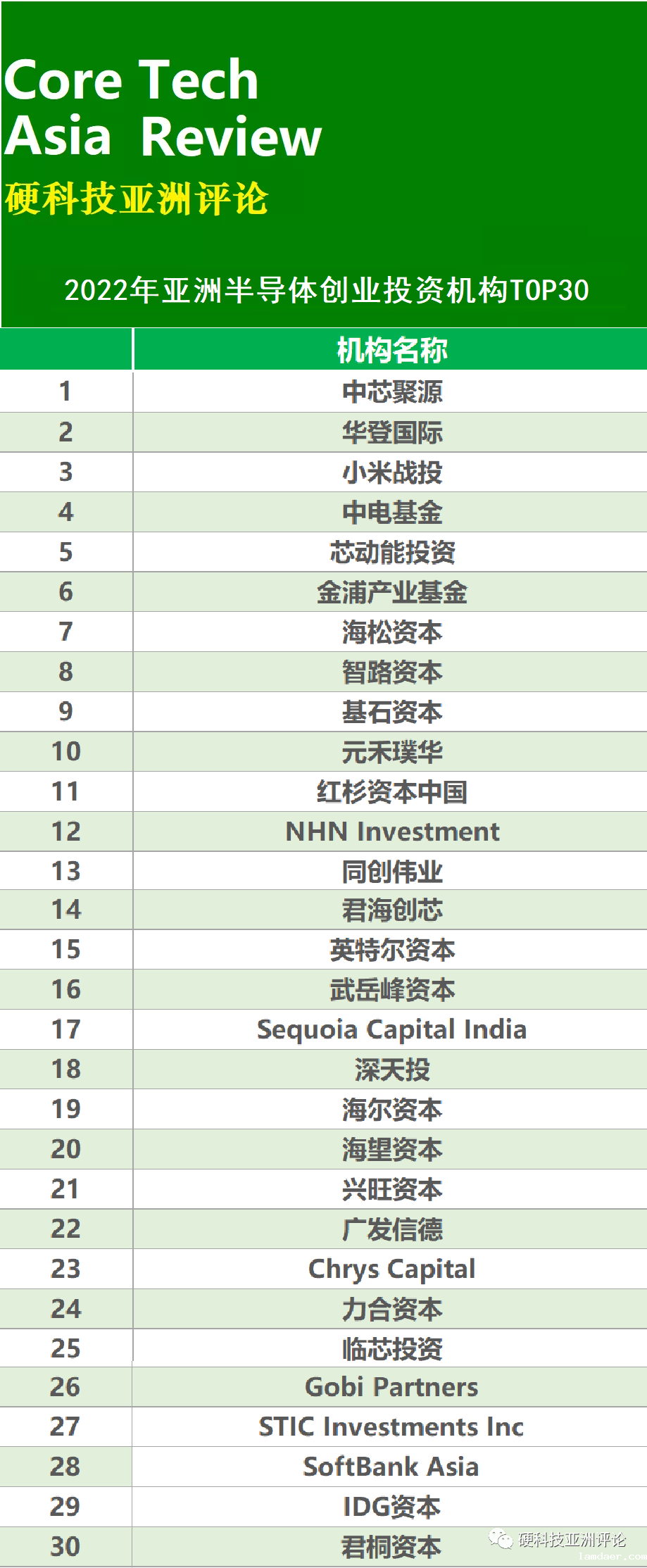 中芯聚源、同创伟业入选「2022年亚洲半导体创业投资机构TOP30」