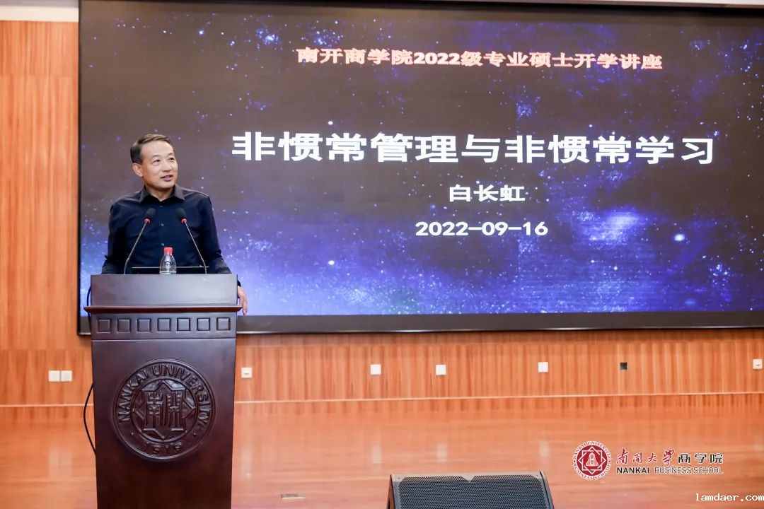 2022年9月16日晚,南开大学商学院2022级专业硕士新生开学典礼的仪式落幕后,新生第一课正式开始,主讲嘉宾为南开大学商学院院长白长虹教授。白院长的课程名称为《非惯常管理与非惯常学习》,主要从三个方面展开:一是大变局、新时代与管理学习;二是非惯常环境的启发:知识旋转与学习;三是非惯常环境的启发:管理创新。