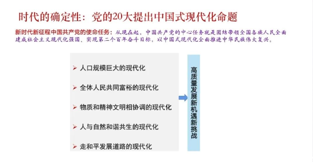 当然除了VUCA的特征,中国企业家也有时代的确定性,那就是党的二十大提出了中国式现代化命题,明确了中国共产党的使命任务,以中国式现代化全面推进中华民族伟大复兴。中国式现代化是未来要走的路,这是确定的东西。这里有总体特征的描述、使命的要求,也提出了要以高质量发展来面对这个时代的命题。