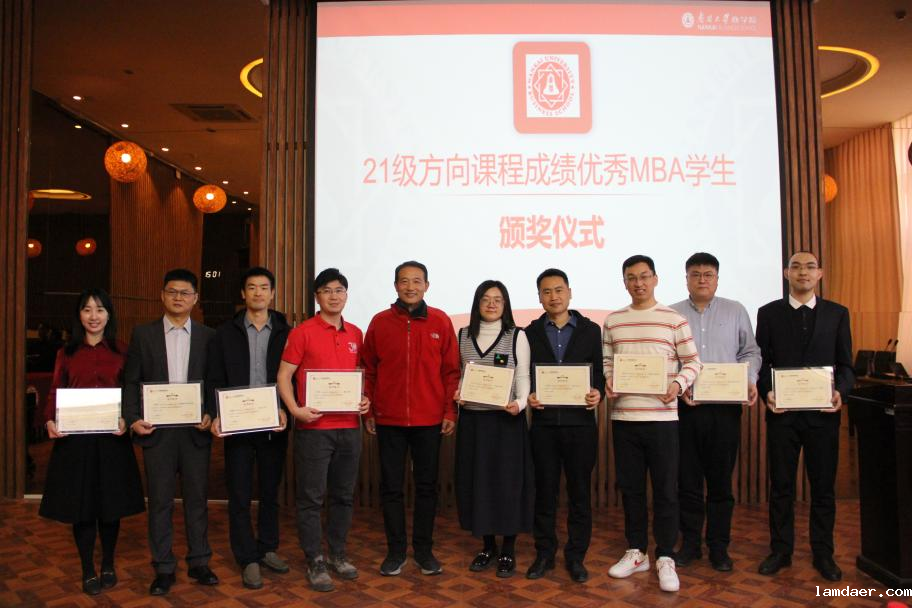 随后的环节,白院长为21 级成绩优秀的 MBA 同学颁奖并合影留念。21级MBA 学生代表、中国移动天津公司的徐晨同学就新开课程分享了学习心得。