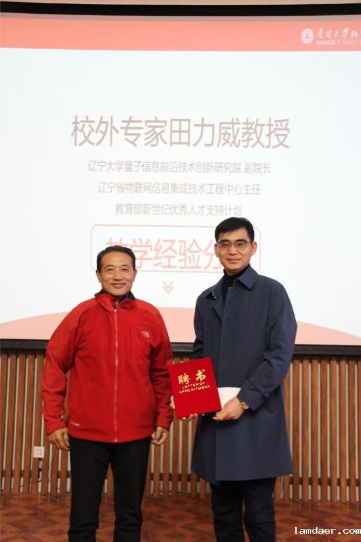 随后,白长虹院长为校外专家田力威教授颁发聘书。田力威教授进行了教学经验的分享。首先,田教授感慨于项目从酝酿到实施到现如今的成绩这一过程中的不易。田教授眼中的商学院老师们,做事认真细致,既有科学性又有知识性,同时又体现着一种追求卓越的和现实的精神。田教授表示,整个MBA 的教学工作不仅仅是一个教学体系,更多的是围绕着基于人才培养、科研创新等为一体的成果在教学过程中要不断思变、转变和求变。田教授提出,在国际化形势的压力下,信息安全一定是MBA 项目求变的工具和抓手。最后,田教授对信息安全管理方向取得的优异成绩表示了祝贺,并祝愿南开大学商学院及MBA建设愈加添彩。