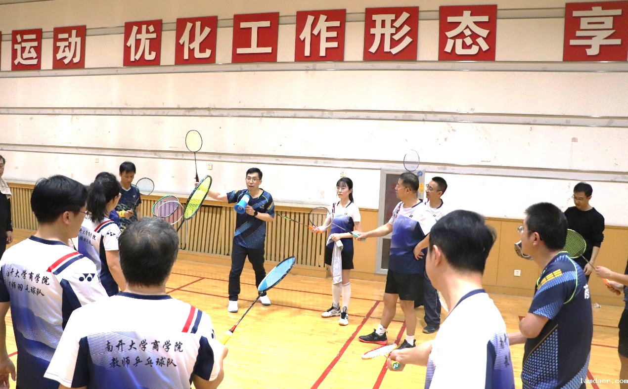 商学院秉承南开体育精神,不断致力于推动教职工体育活动,商学院工会职工小家为老师们配备了多种专业锻炼健身器材,还开辟了羽毛球和乒乓球室内专业活动场地。在浓厚体育氛围中,商学院不仅组建了羽毛球队,还相继成立了篮球队、乒乓球队和足球队,这四大教职工球队均自发设有队长,同时每个队员配置了统一的队服,全面展示学院教师风貌,并定期开展相关活动。为提升老师们的球类技术水平并最大限度地避免运动意外伤害,四大球队也会定期组织专业的培训活动。