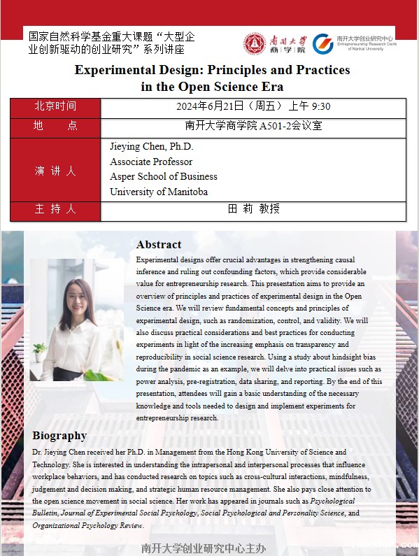 Experimental designs offer crucial advantages in strengthening causal inference and ruling out confounding factors, which provide considerable value for entrepreneurship research. This presentation aims to provide an overview of principles and practices of experimental design in the Open Science era. We will review fundamental concepts and principles of experimental design, such as randomization, control, and validity. We will also discuss practical considerations and best practices for conducting experiments in light of the increasing emphasis on transparency and reproducibility in social science research. Using a study about hindsight bias during the pandemic as an example, we will delve into practical issues such as power analysis, pre-registration, data sharing, and reporting. By the end of this presentation, attendees will gain a basic understanding of the necessary knowledge and tools needed to design and implement experiments for entrepreneurship research.