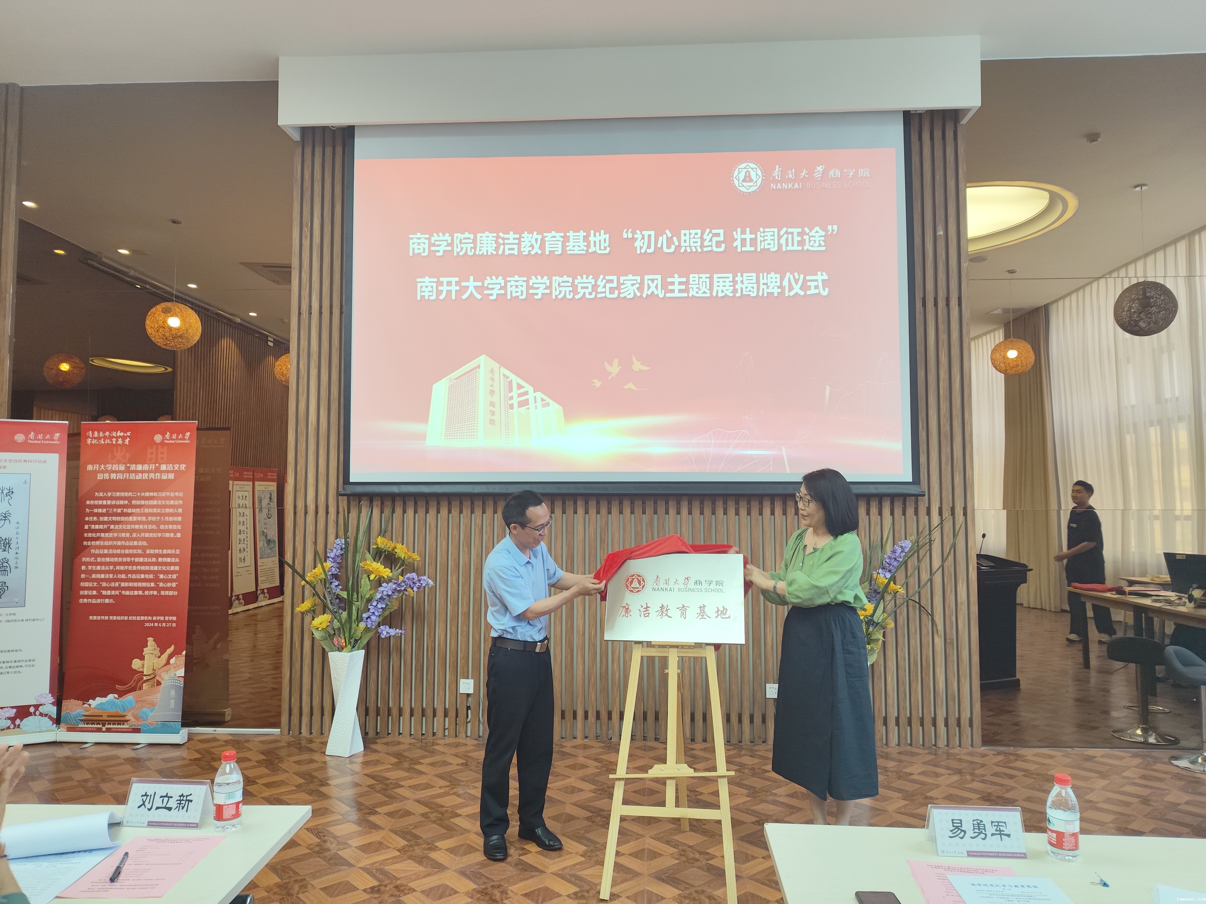 6月27日,南开大学商学院A301举行了商学院廉洁教育基地揭牌仪式,在热烈的掌声中,南开大学纪委副书记易勇军和商学院党委书记王坚共同为商学院廉洁教育基地揭牌。与会嘉宾在商学院专职组织员王媛媛的讲解下,共同参观了主题展。