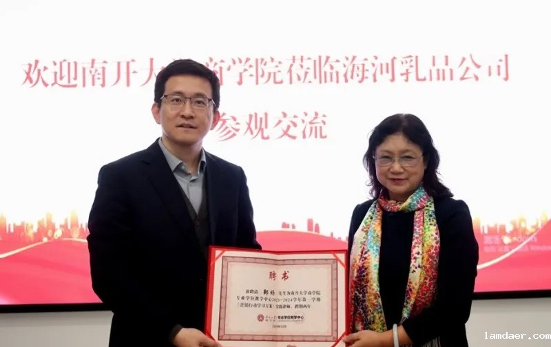 实地感受完海河乳品的产品后,同学们返回会议室。南开大学商学院许晖教授为海河乳品公司党委书记、董事长邹旸先生颁发了《营销行动学习方案》实践导师的聘书。随后邹旸董事长作了题为海河乳品战略发展报告,并从海河乳品的业务板块、公司发展战略规划、制度改革、品牌建设、渠道建设、产品布局结构以及企业数字化转型方面向同学们介绍了企业的相关情况。此外,王迎军教授为同学们介绍了“超强竞争”的相关知识,通过分析和介绍超强竞争的背景、特点和例子,引发大家对老字号品牌如何打造核心竞争优势的思考。报告过后,同学们就自己的问题与邹总和王教授进行了更为细致的交流。早上的参观和座谈活动在热烈地讨论中结束。