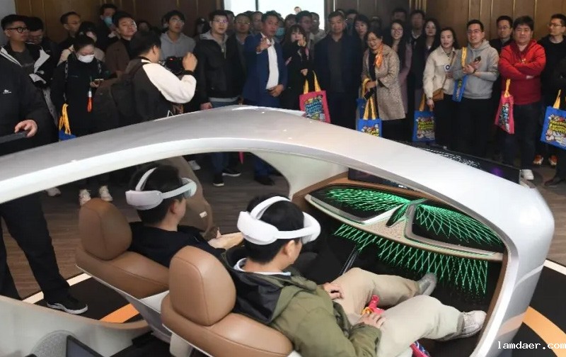 随后,工作人员带领老师和同学们来到V1智能实验室,了解集团参与合作的智能网联汽车和技术的发展现状。老师和同学们通过VR眼镜体验了载人飞行器V.MO项目,置身与原型机内,通过VR技术模拟飞行器的在城市低空和城市间短中途的出行经历。这款纯电动、全自主飞行的eVTOL载人飞行器最终将实现运载四名乘客及行李物品飞行长达200公里,疏解大型城市交通拥堵问题,在未来城市和城际交通中发挥重要作用。同时,该实验室也是赛车手熟悉赛车跑道的智能模拟场景。实验室配备1:1还原的赛车装备,通过超清大屏模拟赛道驾驶场景,帮助来访客户群体验全新、刺激和专业赛道,并协助赛车手提前充分了解场地特点。
