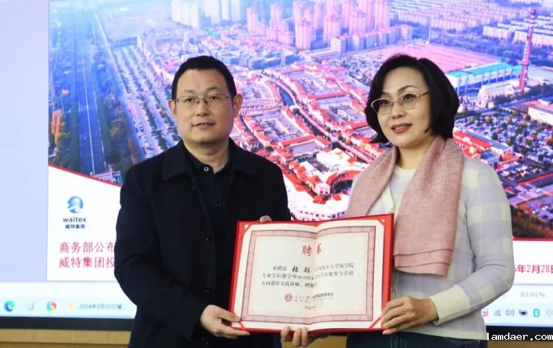 威特集团首席执行官张颖女士带领大家来到威特集团会议室,与大家分享威特集团的发展历程及佛罗伦萨小镇商圈近期赛事活动。美国威特集团是包含威特供应链服务、威特服装公司和威特全球投资的全球化综合集团,威特集团佛罗伦萨小镇、创意米兰生活广场、V1 汽车世界三大板块所形成的特色消费生态圈在国际消费中心场景下的规划和打造,以“新技术”、“新业态”和“新模式”支撑传统消费拓展。南开大学商学院专业学位教学中心副主任梁峰为张总颁发了服务与营销方向课程实践讲师聘书。