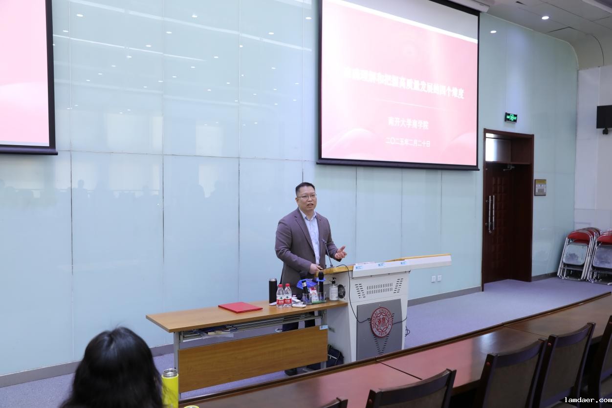 (通讯员:姜忆楠)2月20日下午,商学院“一公多能”人才队伍培养计划新学期首讲,马克思主义学院蓝海副教授作了《准确理解和把握高质量发展的四个维度》专题讲座,学院全体管理职员与部分教师参加学习,学院党委副书记周翠翠主持本次活动。