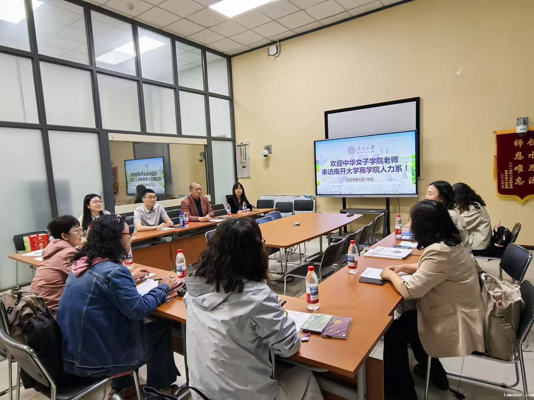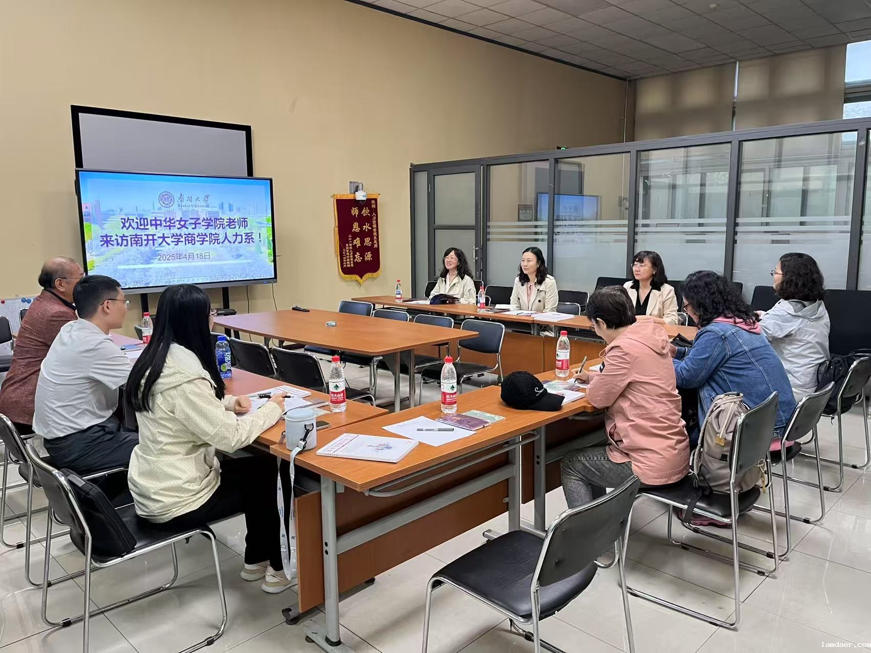 2025年4月18日星期五,中华女子学院管理学院张瑞娟、高秀娟、刘利、马慧琼、邵玉杰、王懿一行六位教师到访南开大学商学院人力资源管理系,就本科教学改革、人才培养创新、数智时代学科转型等议题开展专题研讨。南开大学商学院人力资源管理系袁庆宏、王琳琳、李全、卞心怡四位教师参与交流。