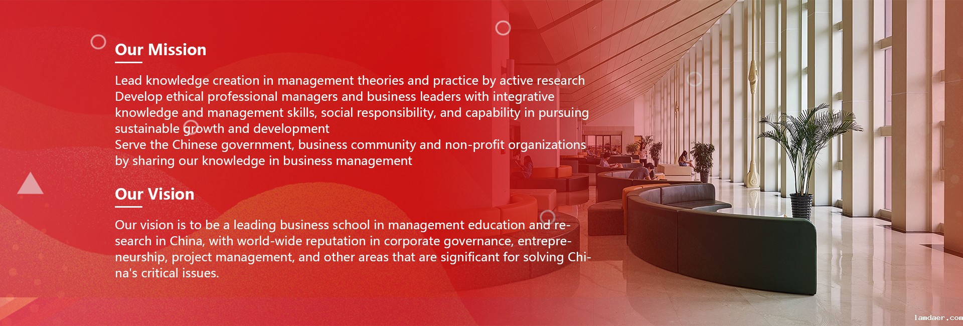Lead knowledge creation in management theories and practice by active research.Develop ethical professional managers and business leaders with integrative knowledge and management skills, social responsibility, and capability in pursuing sustainable growth and development.Serve the Chinese government, business community and non-profit organizations by sharing our knowledge in business management